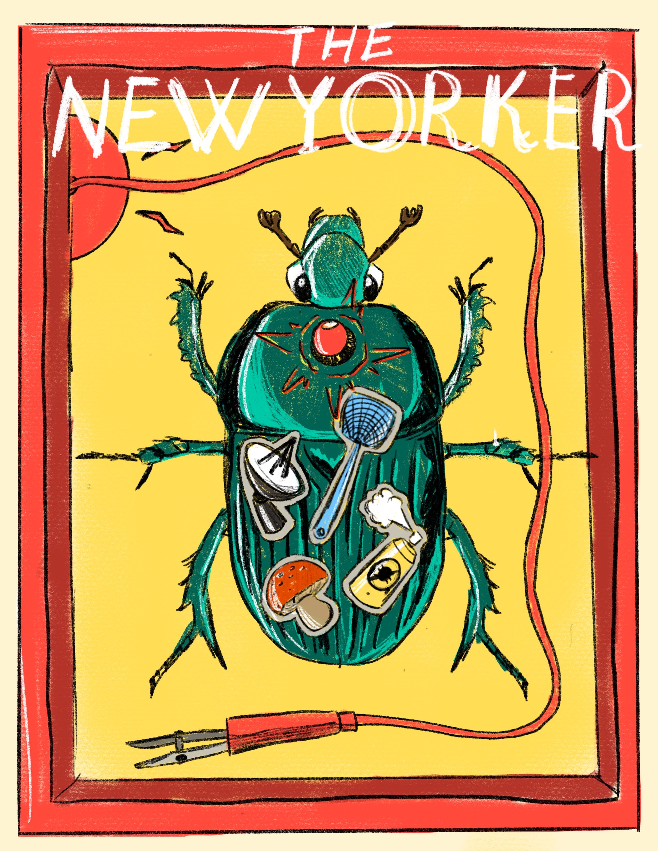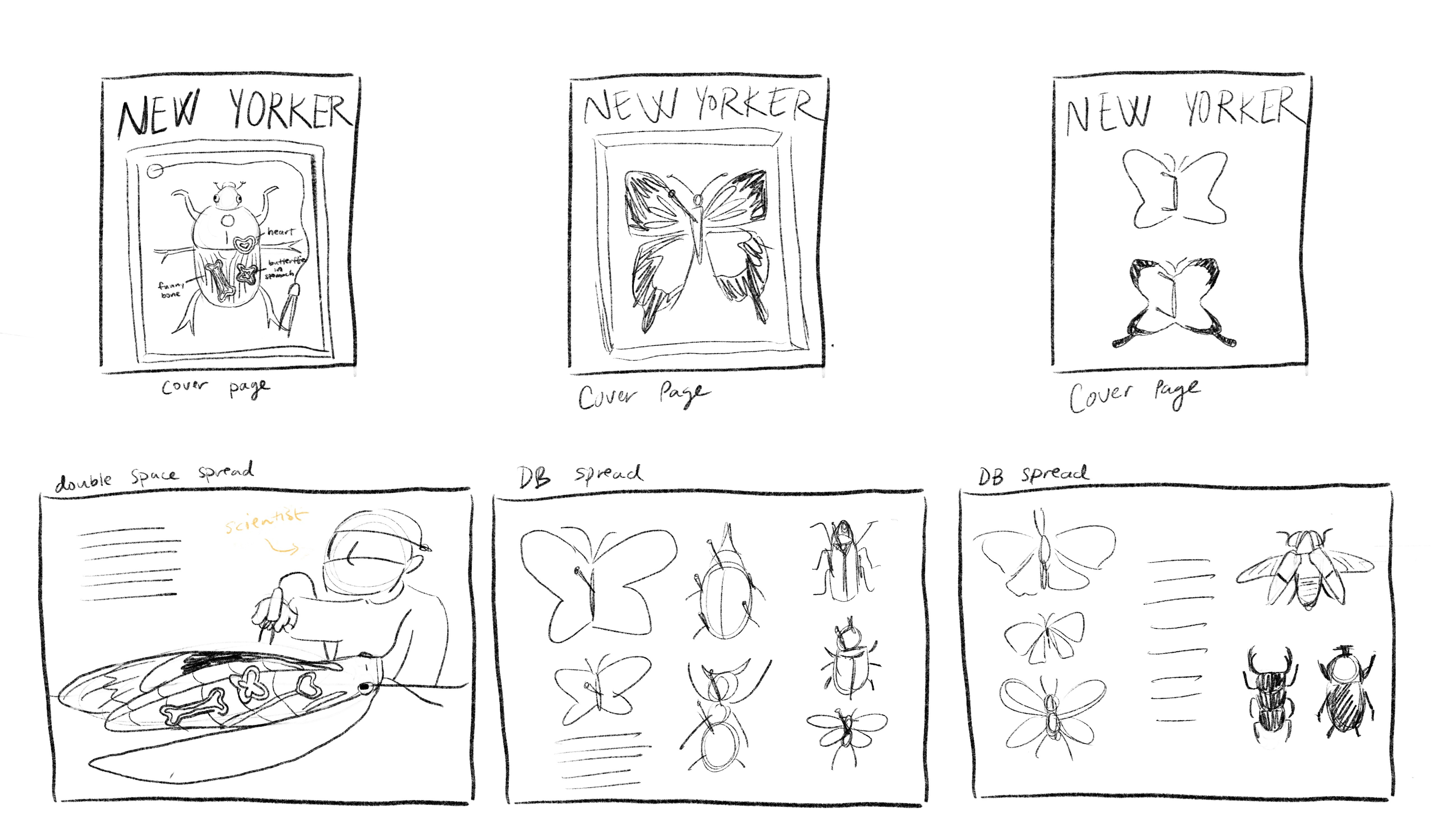 This illustration was inspired by the article "Do Bugs Feel Pain?" by Shayla Love. Which talks about cosmetic and medicine tests done on various types of bugs, and if they can feel it or not. Before I even read the article, my mind immediately thought of bugs pinned to a wall because that looks painful, even though they may not be alive. Another thing my mind went to was the game I played a lot in my childhood “Operation”, a children’s board game where you need to pick out the plastic bits from his body without touching the metal rim surrounding the plastic bits. If you do the man will yell and the alarm will go off. These were the initial ideas I went off.